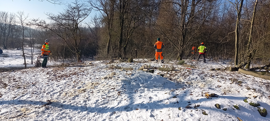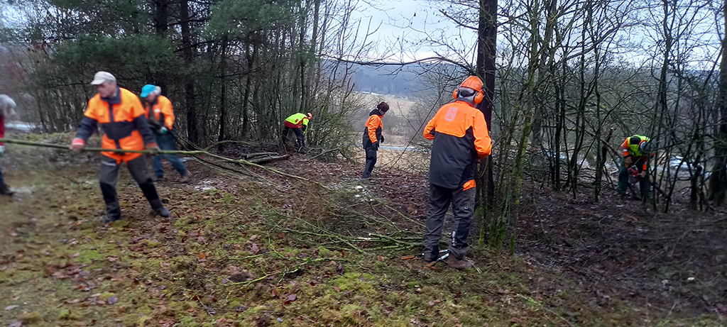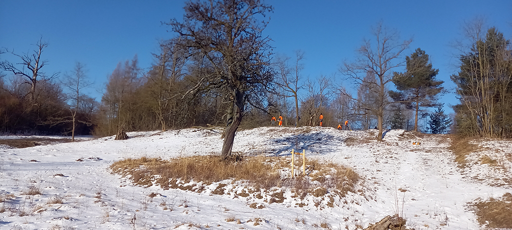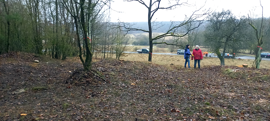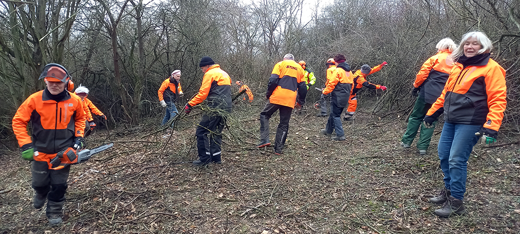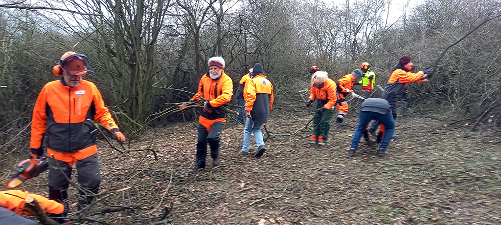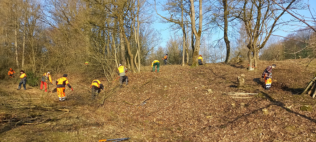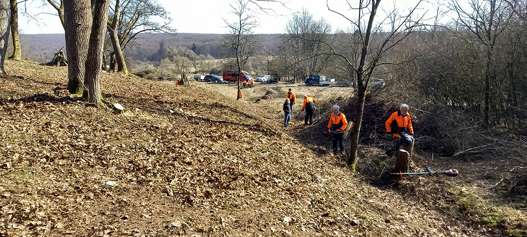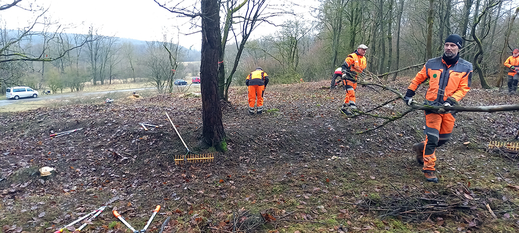 Wir befreien die Südseite des Hügels bis runter zum Querweg noch von etlichen Bäumen und Gebüsch. So kann demnächst die Sonne auch von dieser Seite dem freigestellten Hügel kräftig einheizen. Während ein Teil unserer Mitglieder das neue Schnittgut an den Weg am Fuße des Hanges zum späteren Abtransport schleppt, harken andere die ganze Hügelkuppe und deren östliche und südliche Flanke noch einmal ab. Nun kann sich in den nächsten Jahren dort hoffentlich wieder ein sehr artenreicher Kalk- Magerrasen etablieren.
