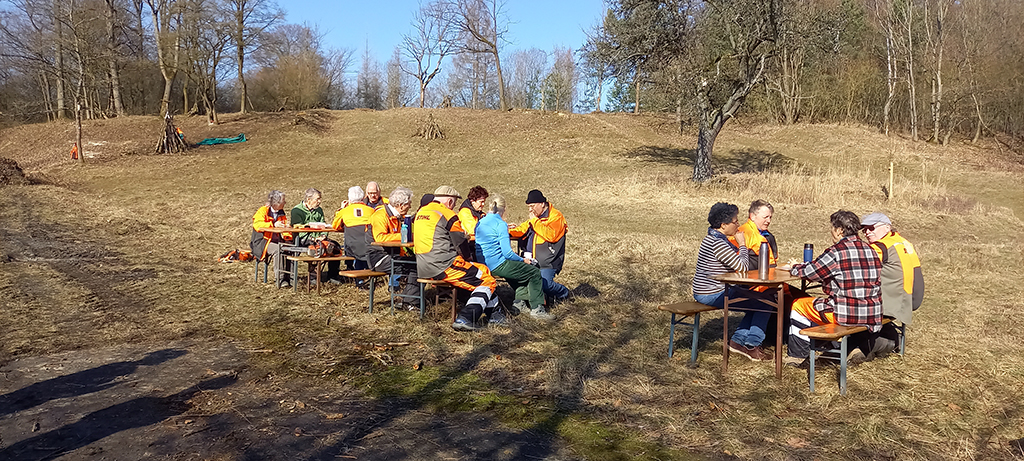 Zum Abschluss des Einsatzes gibt es wieder ein schon traditionelles gemeinsames Frühstück zum Saisonende, zu dem wir auch Frau Lena Dzeia als Leiterin des Stadtwaldes sowie Herrn Steffen Teuteberg vom Stadtwald begrüßen können. Dem Ranger Teuteberg wird bei dieser Gelegenheit mit einem Buch „Die Streuobstwiese, Band I“ besonderer Dank ausgesprochen für die intensive Betreuung unserer Pflegeeinsätze auf dem K-Feld in dieser Saison. Gern wünschen wir uns diese fruchtbare Zusammenarbeit auch für die nächste Saison!
